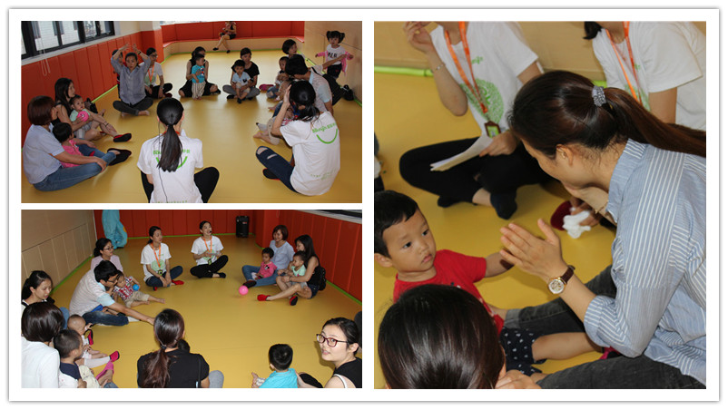 老师带着爸爸妈妈和小朋友们一起做游戏,大家都玩得很开心呢~